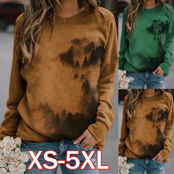 Mountains Pattern Print Sweatshirts Warm Autumn Aesthetic Clothing O Neck Long Sleeve Shirts Women Casual Loose Comfy Tunic Tops